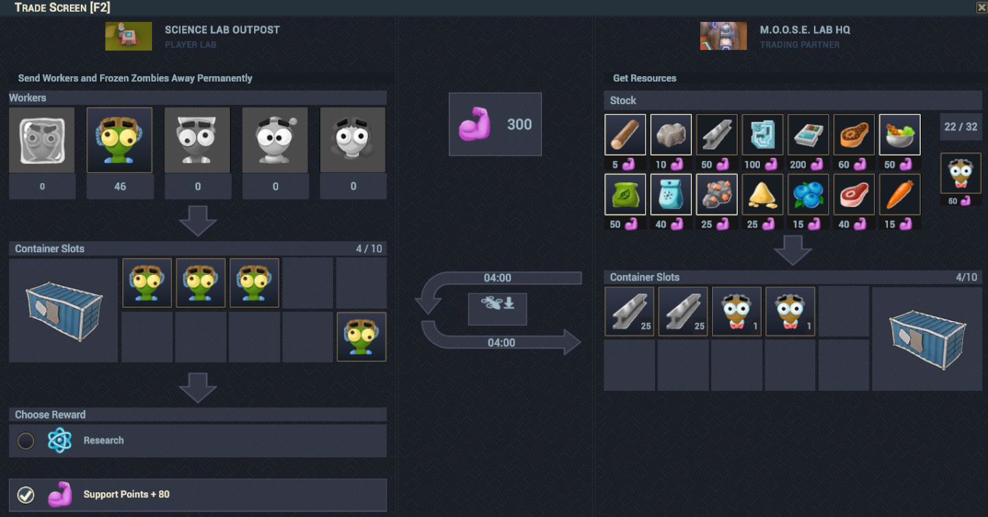 Trading Rework – Resources are no longer free. You now earn support points to request resources, making it more strategic to support your economy. Frozen zombies can be sent away for additional rewards. It’s now a valid strategy to focus on trading instead of local production—for example, sending away workers or frozen zombies to trade for metal.