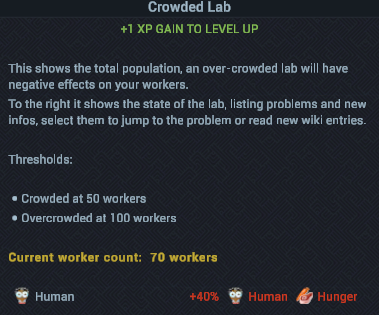 Overcrowded Lab – Labs with too many workers will become “crowded” or “very crowded,” increasing worker needs and reducing calm-down chances. However, overcrowded labs also boost XP gain, creating a strategic trade-off.