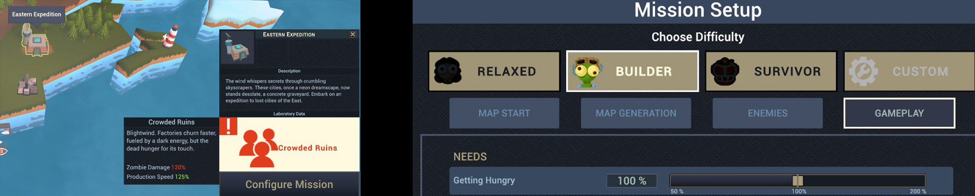 Mission Screen – After the tutorial, four new missions can be selected and customized via a new mission setup screen. Adjust various sliders, start with fences, modify zombie damage, and more to match your preferred playstyle.