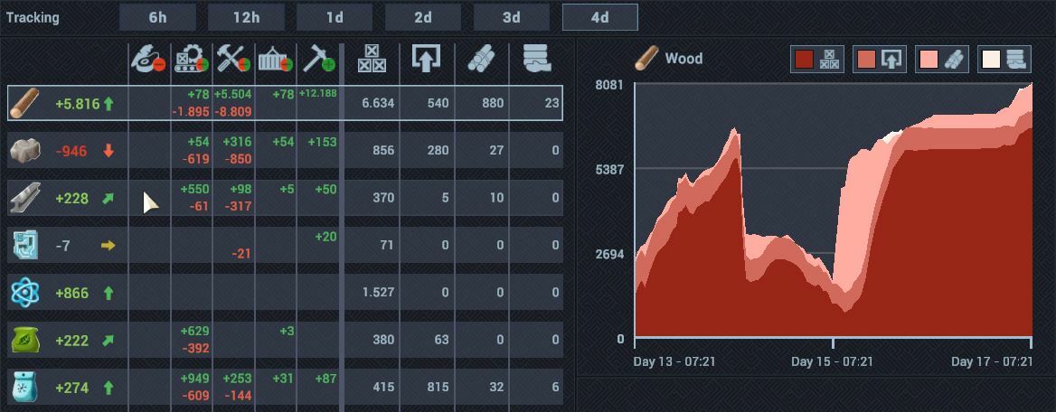 New screen to analyze your economy, check your tracked resources and graphs showing how much was produced and consumed by workers and various machines, helping you to foresee shortages. In the graph you can see how the resources changed between storage types and can set the time frame to look at.