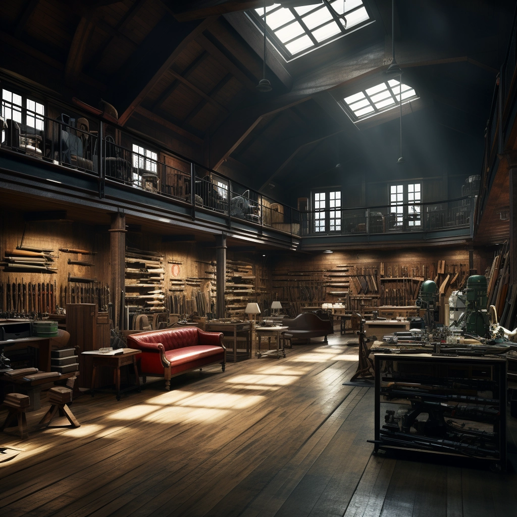 We decided to use Midjourney as our 2d concept artist, both to save costs and to give use enough unique ideas that our hub looks awesome. Here are a few concepts we chose as our final references: The tricky part would be to make the actuall gun purchasing area both functional and pretty. It needs to have a single gun per square, so that you can walk close to it, pick it up and test it. We won't have a standard system where you buy things via a menu. Neither we would have a system where you buy things by clicking on them. No, you pick up a gun, any gun, then you can go to the shooting range to test it. You can see it in your inventory, play with it, do whatever you want. If you change your mind - you can put the gun back, where you took it. If you like the guns you picked up, you come to your boss and pay for all of them.