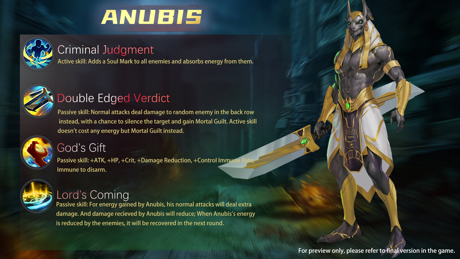 Greetings survivors, We have done the update and thank you for your continued support. [Update Content] 1. Added a new Evil defense hero - Anubis 2. Added a new limited skin for Wong - Breaking Free 3. Added the function of auto-play for Tower of Doomsday 4. Optimized the level details interface of the Tower of Doomsday, now clicking challenge can start the challenge with the default lineup 5. Fixed the bug that the effect of Mosra's Necromantic Gaze would disappear in advance though the number of the effect rounds has been extended by Taki's Flying Sand and Stone 6. Fixed the bug that the value display of HP deduction was incorrect for Barubel receiving the damage of Magnum Shot from Arashi after comprehending Anger of Holy Beast