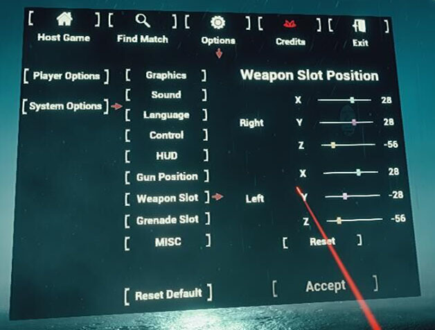 Now you can fully custom your Weapon/Grenade slot! You can find it in SystemOption-Weapon Slot /Grenade Slot. Attention! When you enter the setting the slot’s frame will display. However the Weapon Slots is around your waist if you look down you will see it .