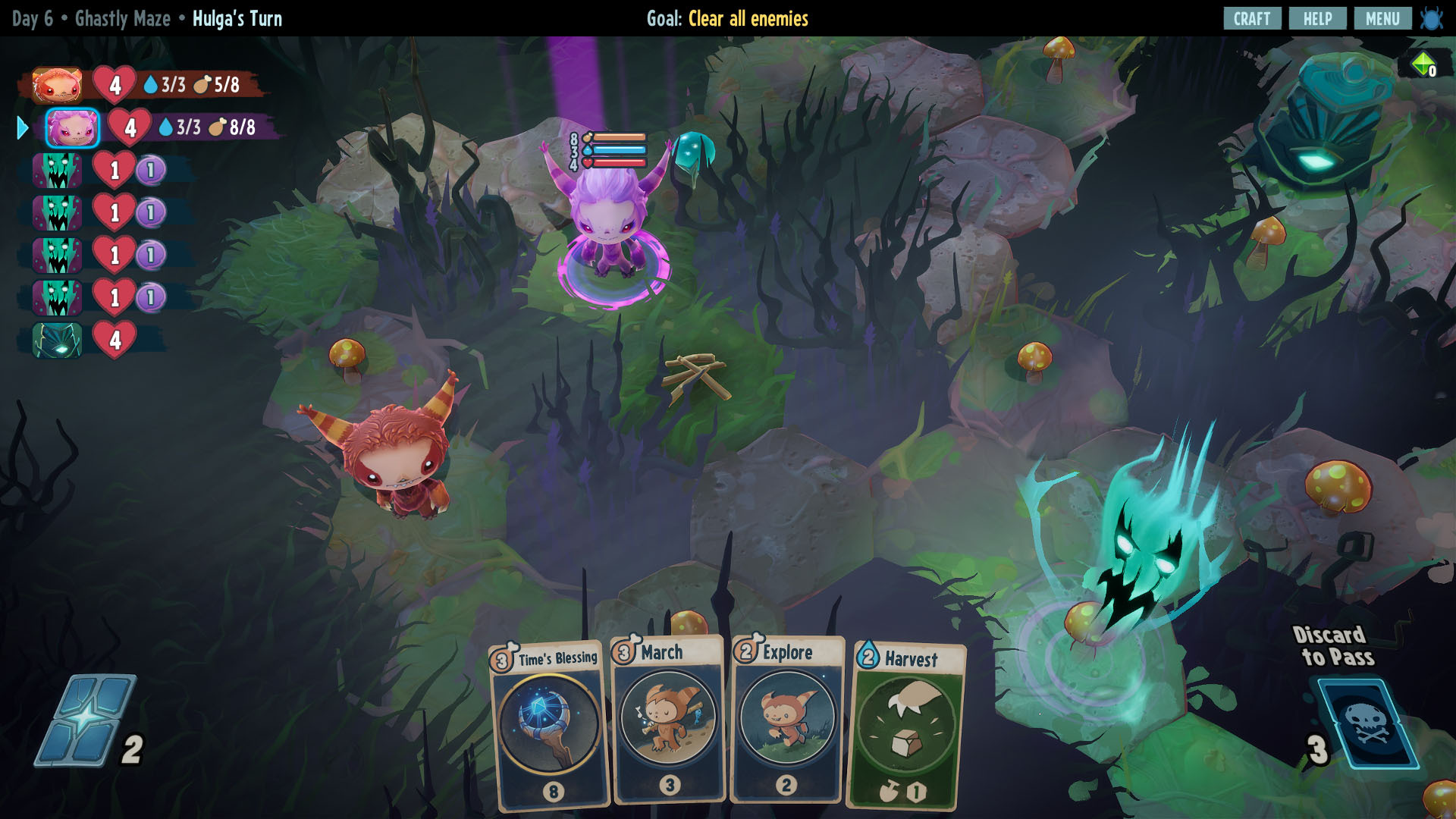 We have been nibbling around the edges of this design problem for years and finally decided to make a tactical withdrawal. The idea of cards being used as ingredients or for their action was something I stuck to for far too long, as it had some great moments (like picking up a rock and using it to take down a bug across the pond). More often though, they just clog the hand and prevent a draw. Also, the sheer number of ingredients leads to too much fragmentation in the crafting system where decisions are often made for you based on what you happen to have.
