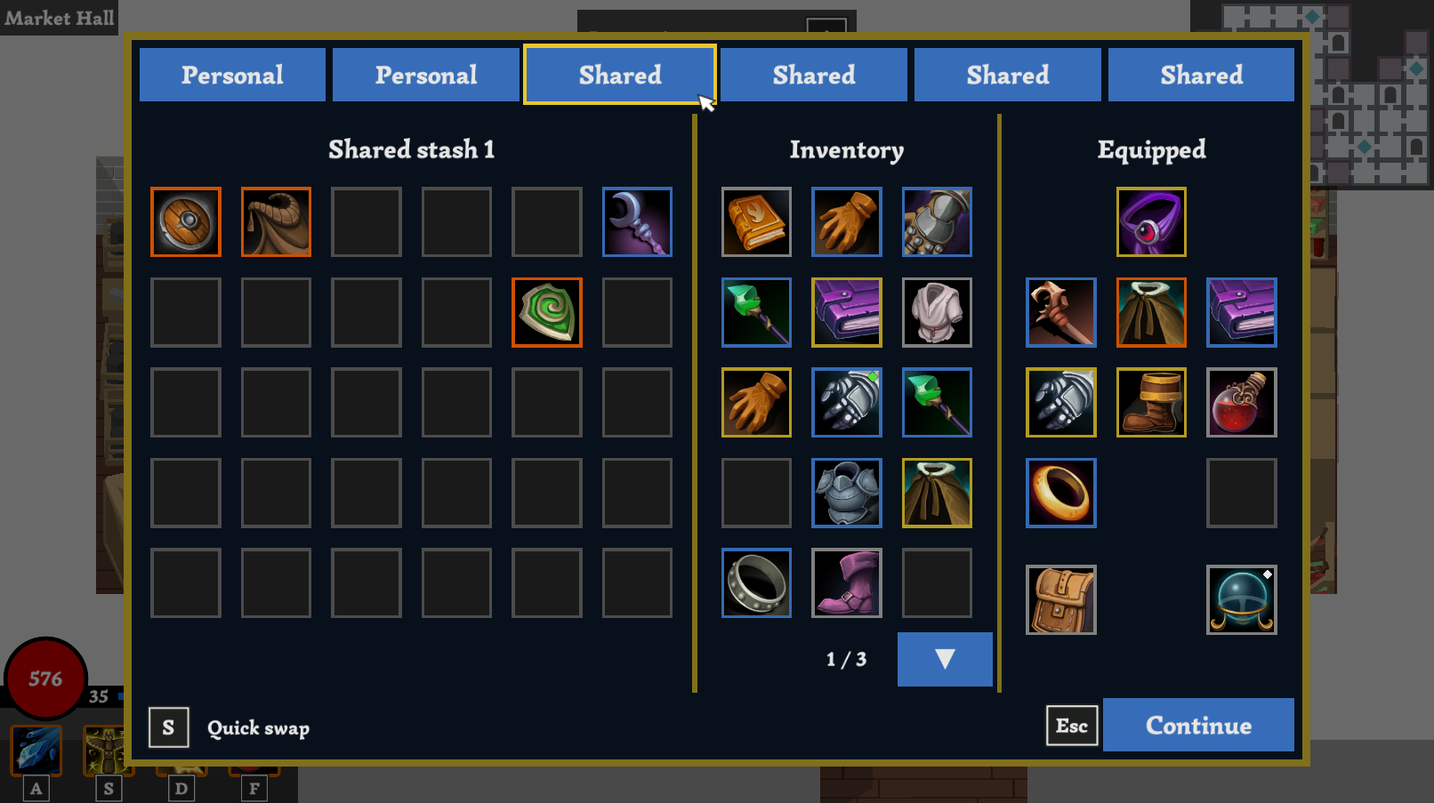 A stash has been added to the Market Hall. It has 6 pages, 2 personal ones (per cat hero) and 4 shared ones. The shared pages are, well, shared amongst all heroes, allowing you to give items from one cat to another. Each page has 30 item slots, so you now have enough space to store every tier 1 and tier 2 epic item (if you want to do that for whatever reason :-D ).