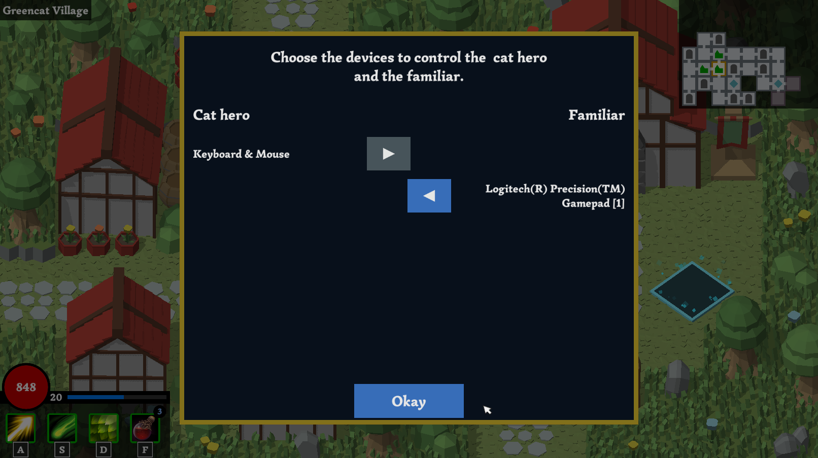 So, the compromise is to have a Familiar that's always the same level as your cat and to make it easy to switch between AI and human controls. A friend wants to join you on your adventure? Great, let them pick a Familiar of their choice and they can right away play together with you. Your friend notices that they don't like low poly style indie games in the middle of dungeon? No problem, switch the Familiar controls back to AI in order to be able to finish the dungeon (and let your friend continue to play sh**ty rip-off mobile games with AAA graphics, *cough* Immortal *cough*).