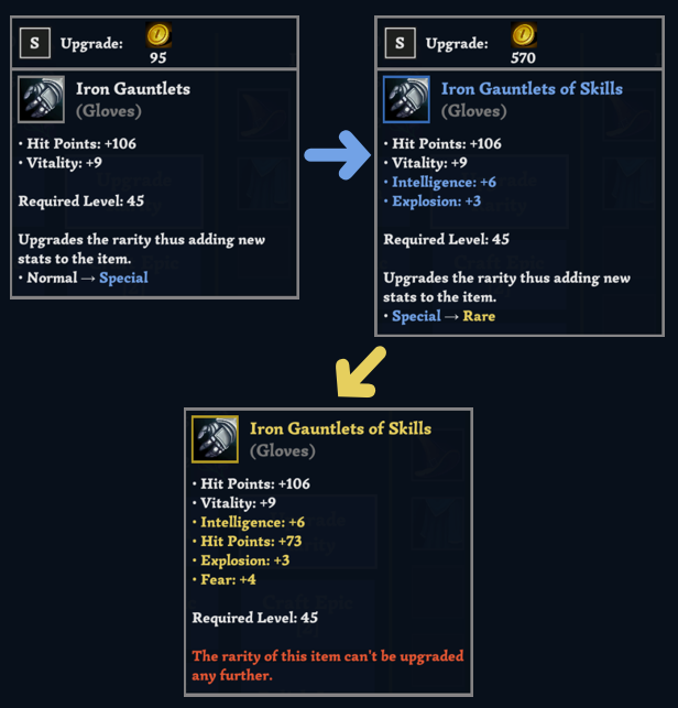 There are normal, special, rare and epic items in ZpellCatz. The Blacksmith is able to upgrade a normal item to special rarity and also to upgrade a special item to a rare one. One of the design pillars of ZpellCatz is "Randomization vs. Reliability". That's why upgrading does not reroll stats. It keeps the old ones (reliability) and adds new random ones (randomization). Also, the level requirements stay the same. So, rarity upgrades are a riskless way to increase an item's overall power.