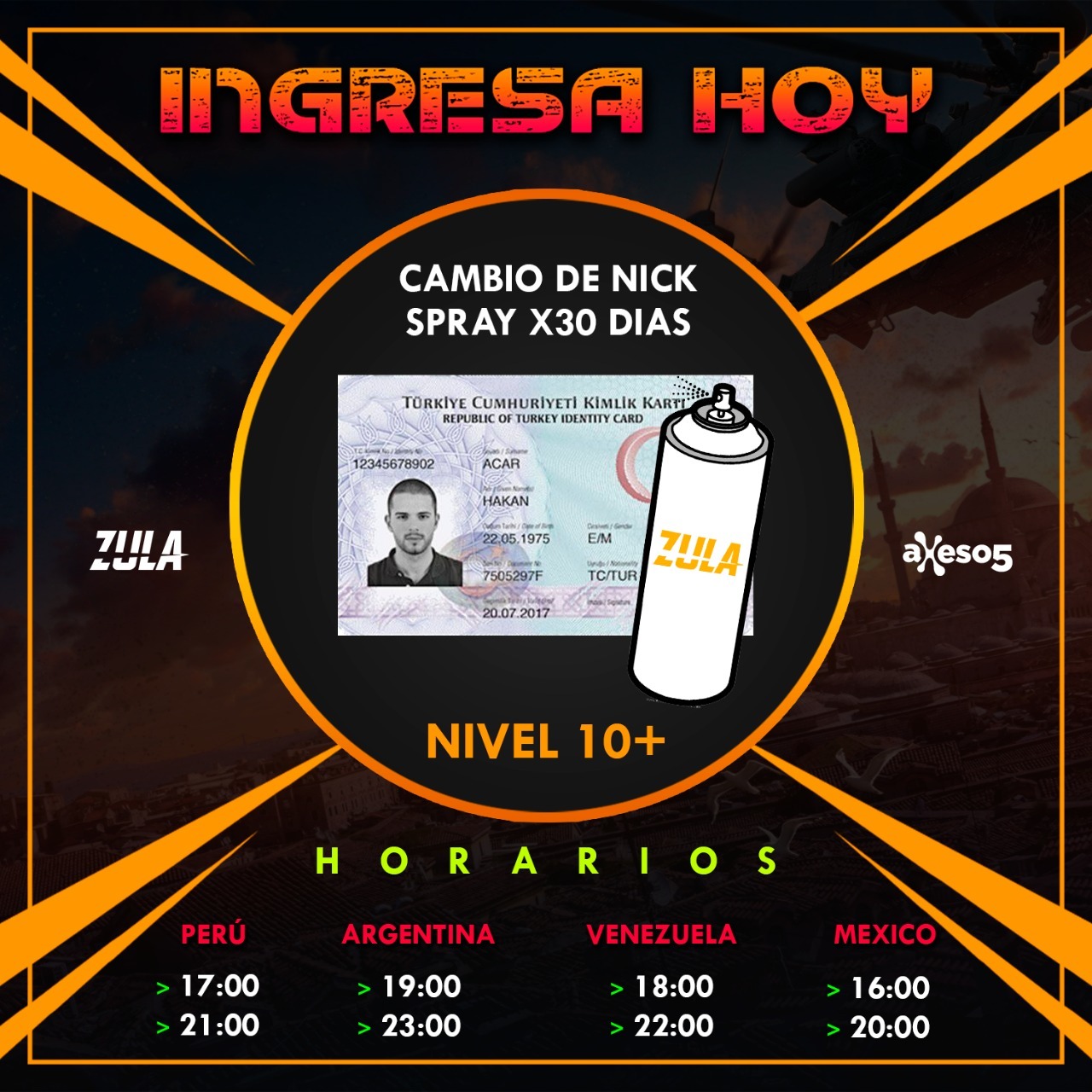 ►Ingresa HOY VIERNES a ZULA entre las 19 y las 23 GMT-3 y RECIBE UN CAMBIO DE NICK + SPRAY “ YO ESTUVE AQUI ” x30 dias!!.! 😍😍😍😍